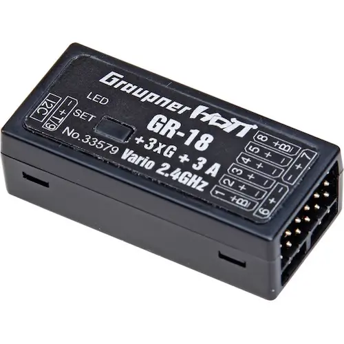 Der Graupner GR-18 +3xG +3A +Vario HoTT Empfänger verfügt über ca. 4000m Reichweite und kann mit bis zu 9 Kanälen belegt werden.
