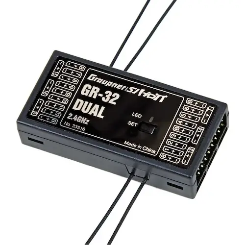 Der Graupner GR-32 HoTT Empfänger verfügt über ca. 5000m Reichweite und kann mit bis zu 16 Kanälen belegt werden.